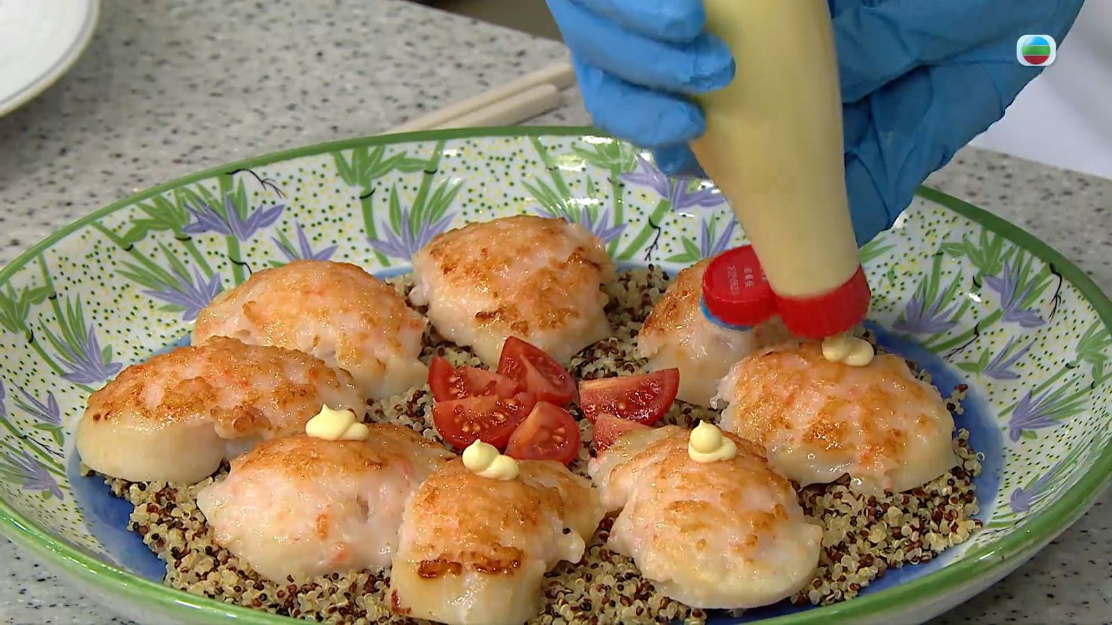 4.灒少許水,以鑊蓋蓋住焗1分鐘內,蝦膠帶子熟後放在藜麥上,蝦膠面放少許沙律醬,再放上三文魚籽即可。