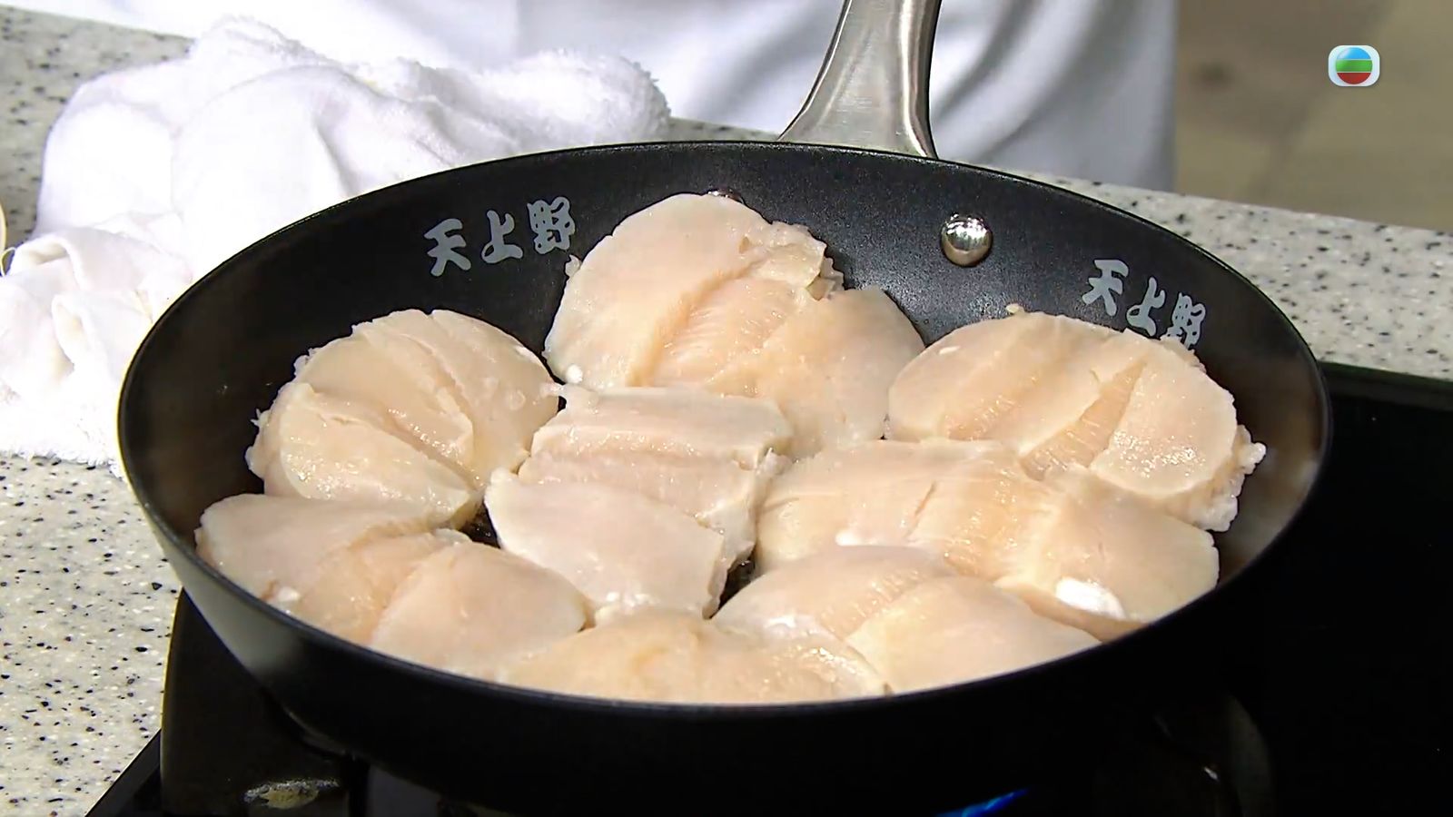 帶子選用日本的刺身帶子,去掉側邊的硬塊之後將其從側一開二,但不要完全切斷,然後稍為汆水之後浸冰水冷卻。之後在帶子其中一面沾上生粉,釀上蝦膠,蝦膠釀之前記得先摔打一下。
