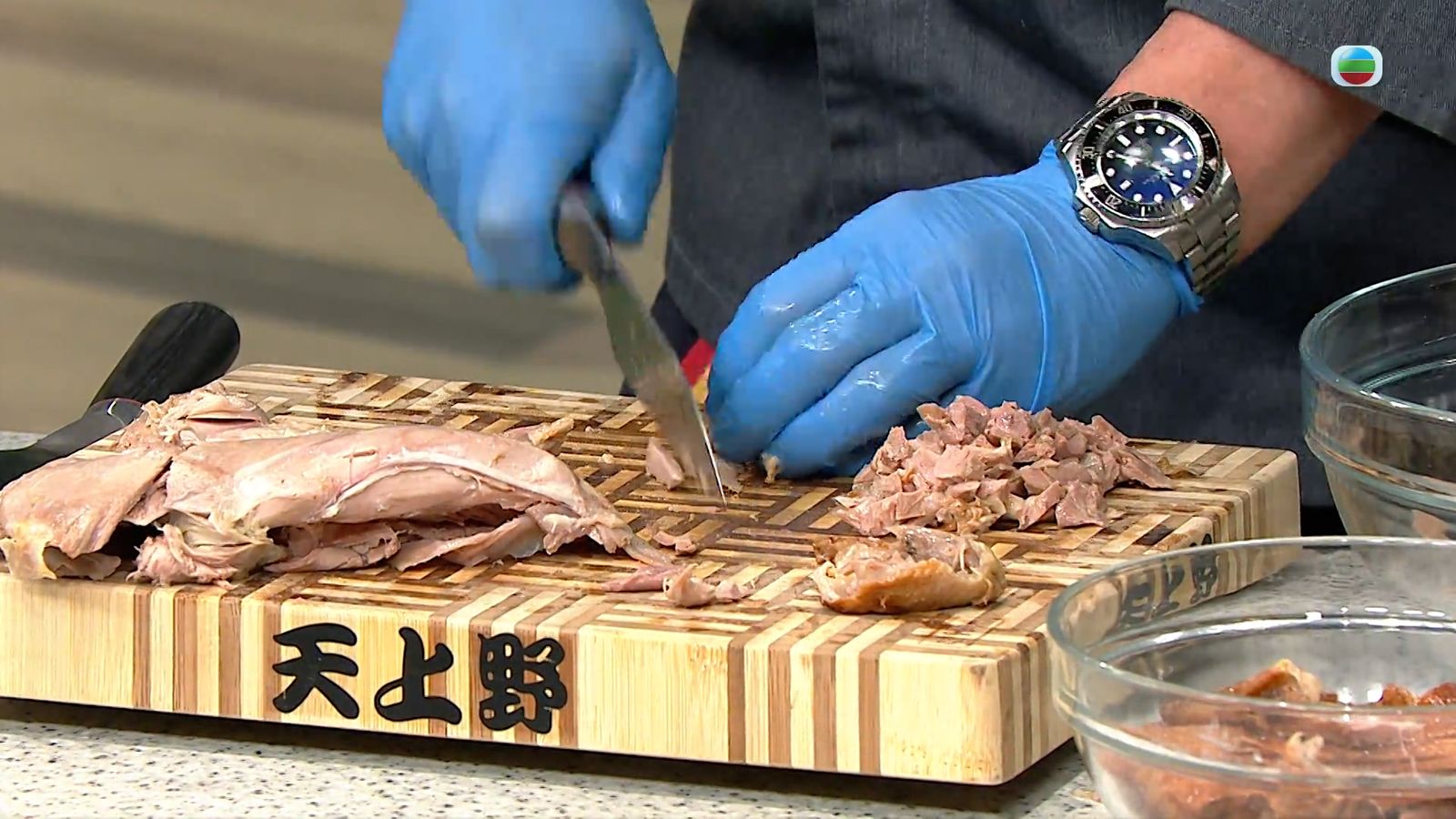 燒鴨起肉切粒,將鴨胸肉、鴨髀肉、鴨皮、鴨骨分開處理。