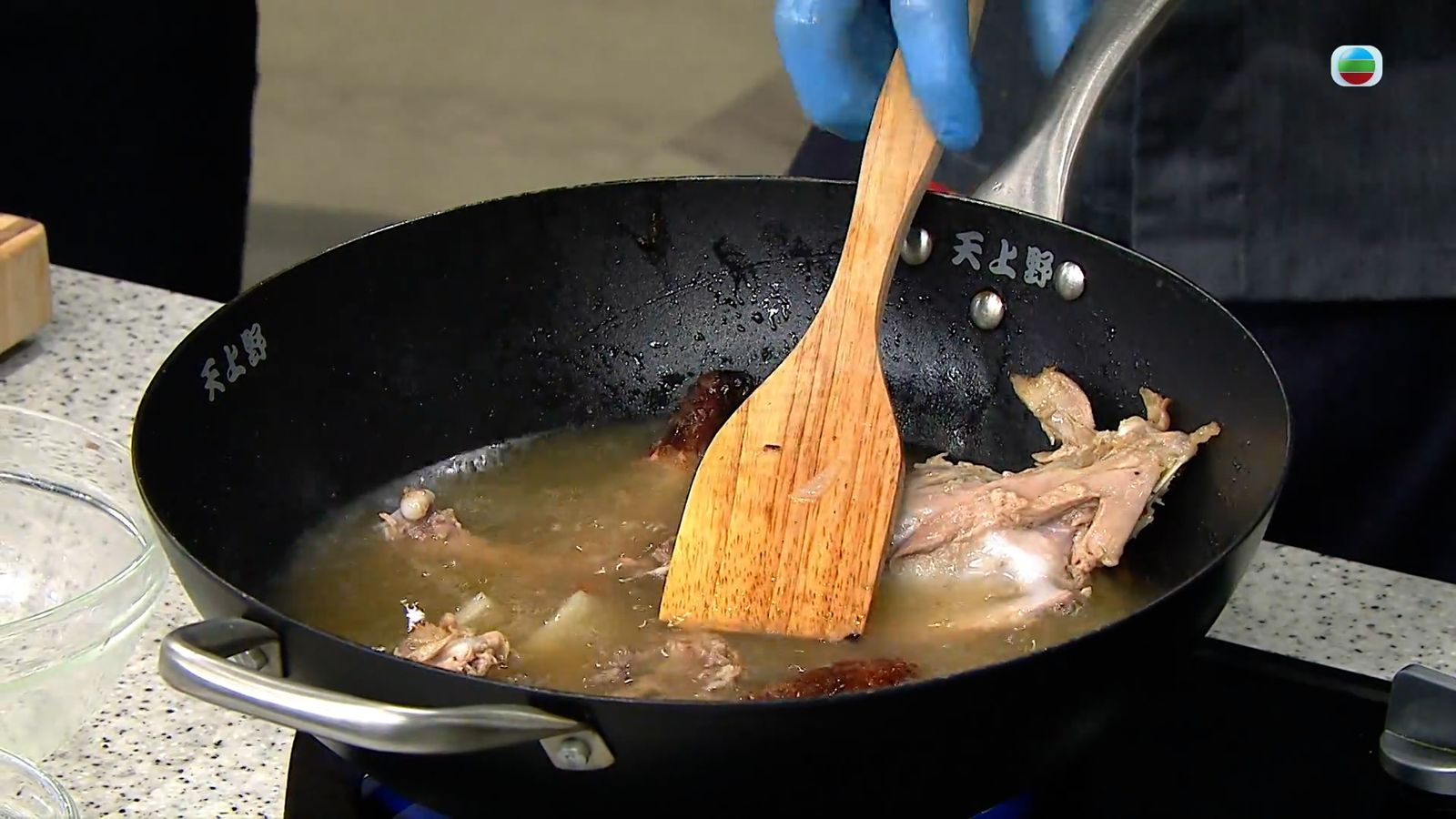 2.鑊內放牛油及鴨皮以大火煎香,再放入燒鴨骨炒香,加入雞湯、陳皮煮約半小時,熬成「燒鴨濃湯」,隔去鴨骨。