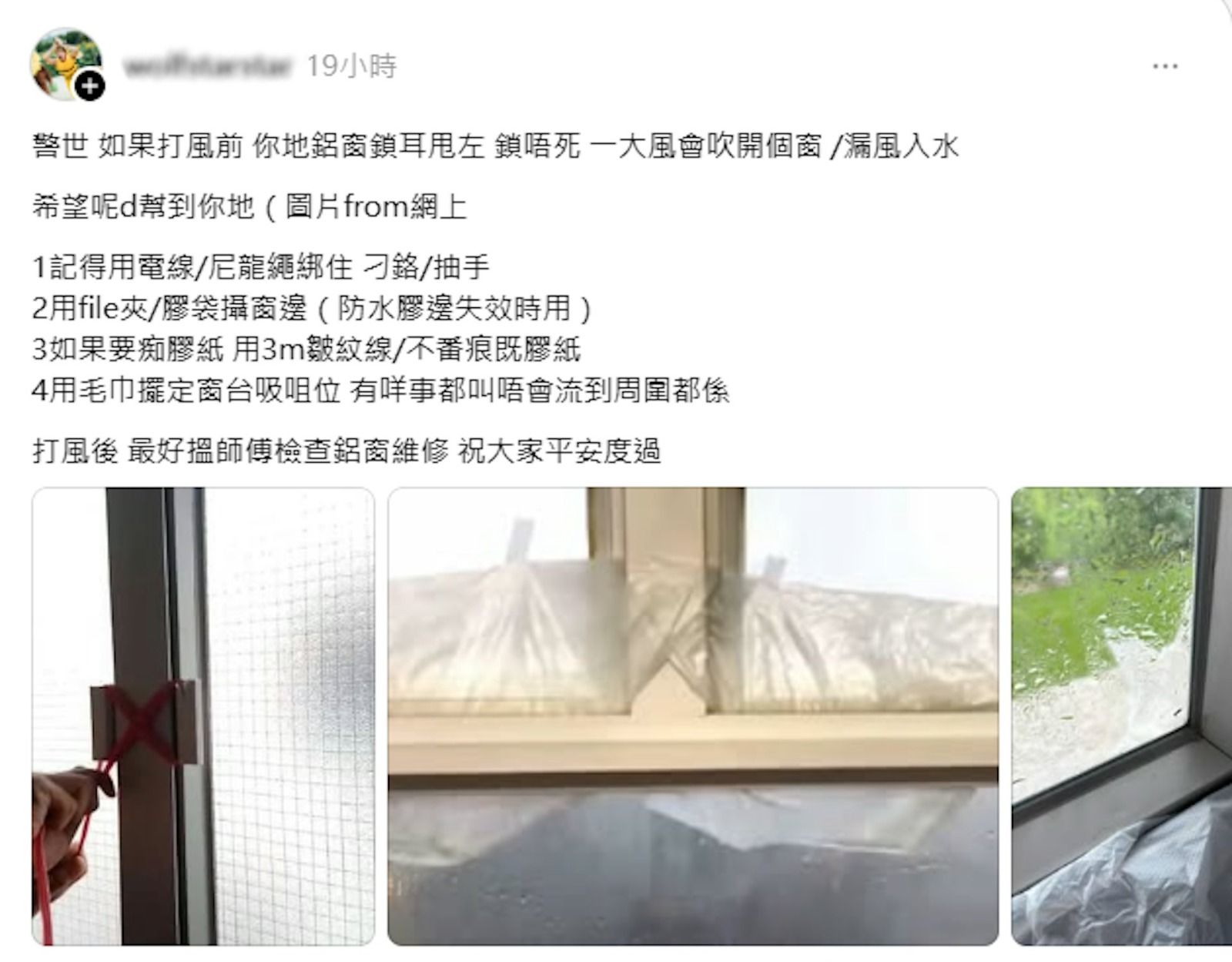 一名裝修師傅於社交平台提出四項窗戶防護建議;首先,可用電線或尼龍繩固定鋁窗開關制及手柄,以防強風吹開窗戶;若防水膠邊退化,可利用文件夾或膠袋夾穩窗邊縫隙;另外,師傅建議貼膠紙防風時宜選用3M皺紋紙或不留痕膠紙,不但易於日後清除膠漬,亦不會損害窗戶表面。若出現漏水情況,可於窗台吸水位放置毛巾,吸收滲水,減低水流入屋風險。