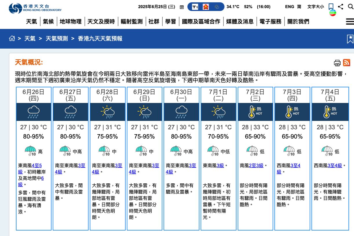 本港今日(25日)稍後有幾陣驟雨,酷熱天氣警告現正生效。天文台發出特別天氣提示,受新熱帶氣旋影響,本港今日稍後有幾陣驟雨,今晚至明日初時離岸及高地風勢較大。