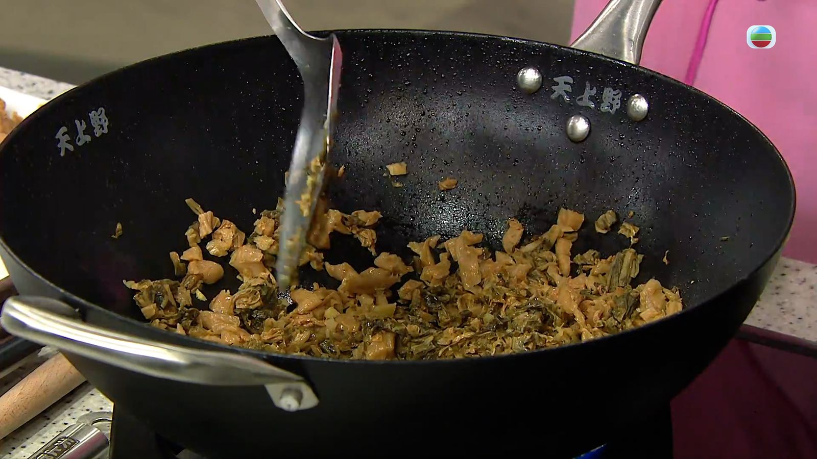 梅菜粒與薑蓉一起炒香,倒入由生抽、老抽、糖加水稀釋拌成的汁料一起煮滾。