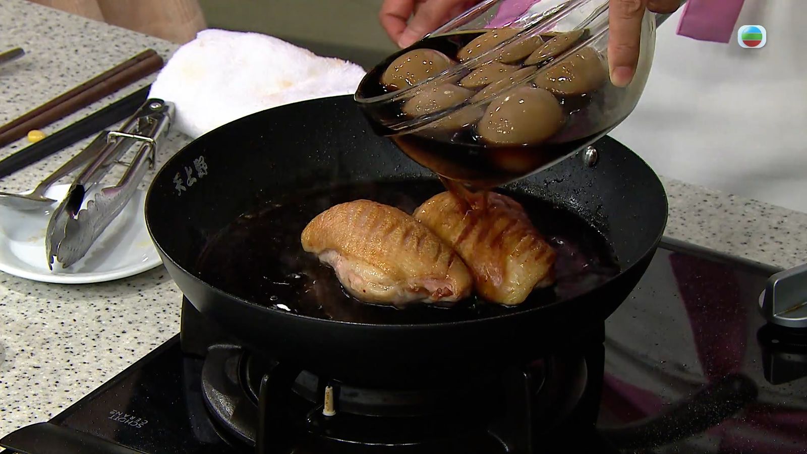 Margaret師傅的這道菜成菜很快,但當中的醬油蛋卻是要提前一天準備。雞蛋先用滾水煮6分30秒,再泡冰水一分鐘,然後敲裂蛋殼,再浸冰水至完全冷卻後去殼備用。同時將豉油、日本清酒、味醂、砂糖一同煮沸,放涼後把雞蛋浸泡一天就成了醬油蛋,切開時呈溏心狀即成功。