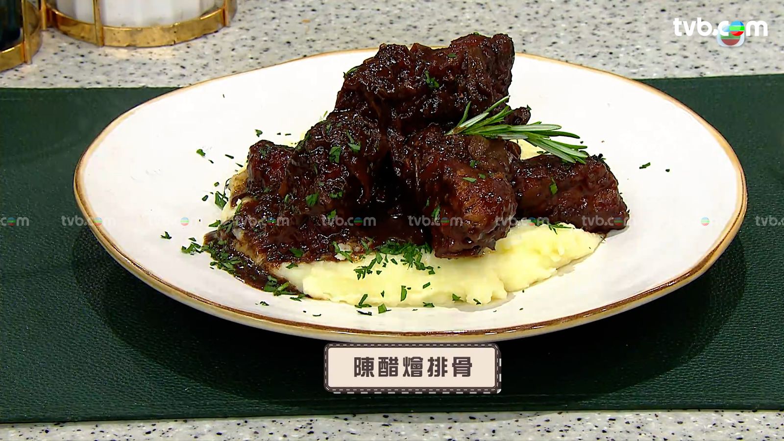 上菜時薯蓉墊底,擺上排骨並淋上醬汁,最後撒上番荽碎和迷迭香葉裝飾即成,大家快來試做吧!