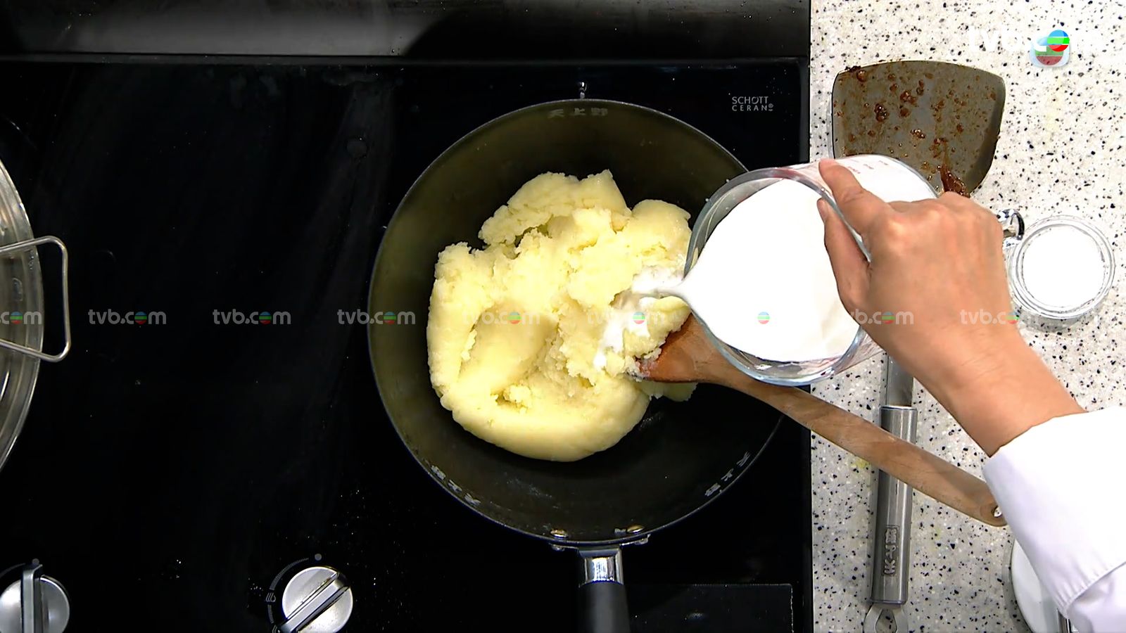期間準備薯蓉,薯仔連皮煮熟後去皮壓成蓉,然後拌入牛油、鹽及牛奶拌成薯蓉備用。