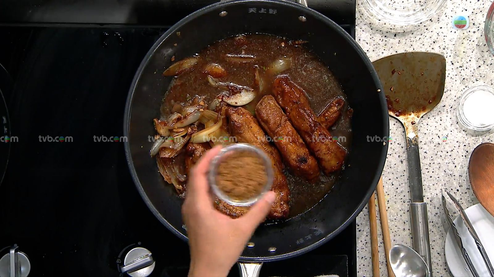 另起白鑊把洋蔥片烘變色,加水煮至軟腍後下油、蒜蓉、迷迭香碎爆香,然後加入紅葡萄酒、黑胡椒粉、陳醋、柱侯醬,再下炸好的豬肋骨、黃糖和水,合蓋燴45分鐘至豬肋骨肉軟腍,然後加鹽關火焗一會。