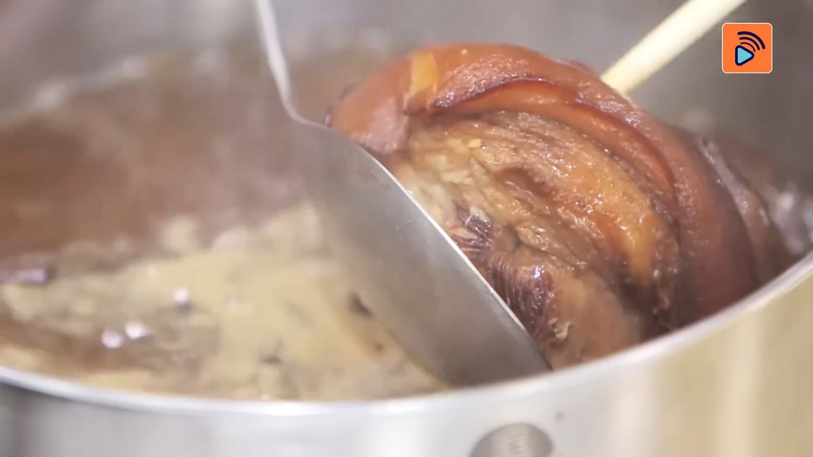 - 取適量燜元蹄的精華湯汁倒入平底鑊,中火加熱後加入生粉水推成濃稠芡汁,最後淋在元蹄上便大功告成。