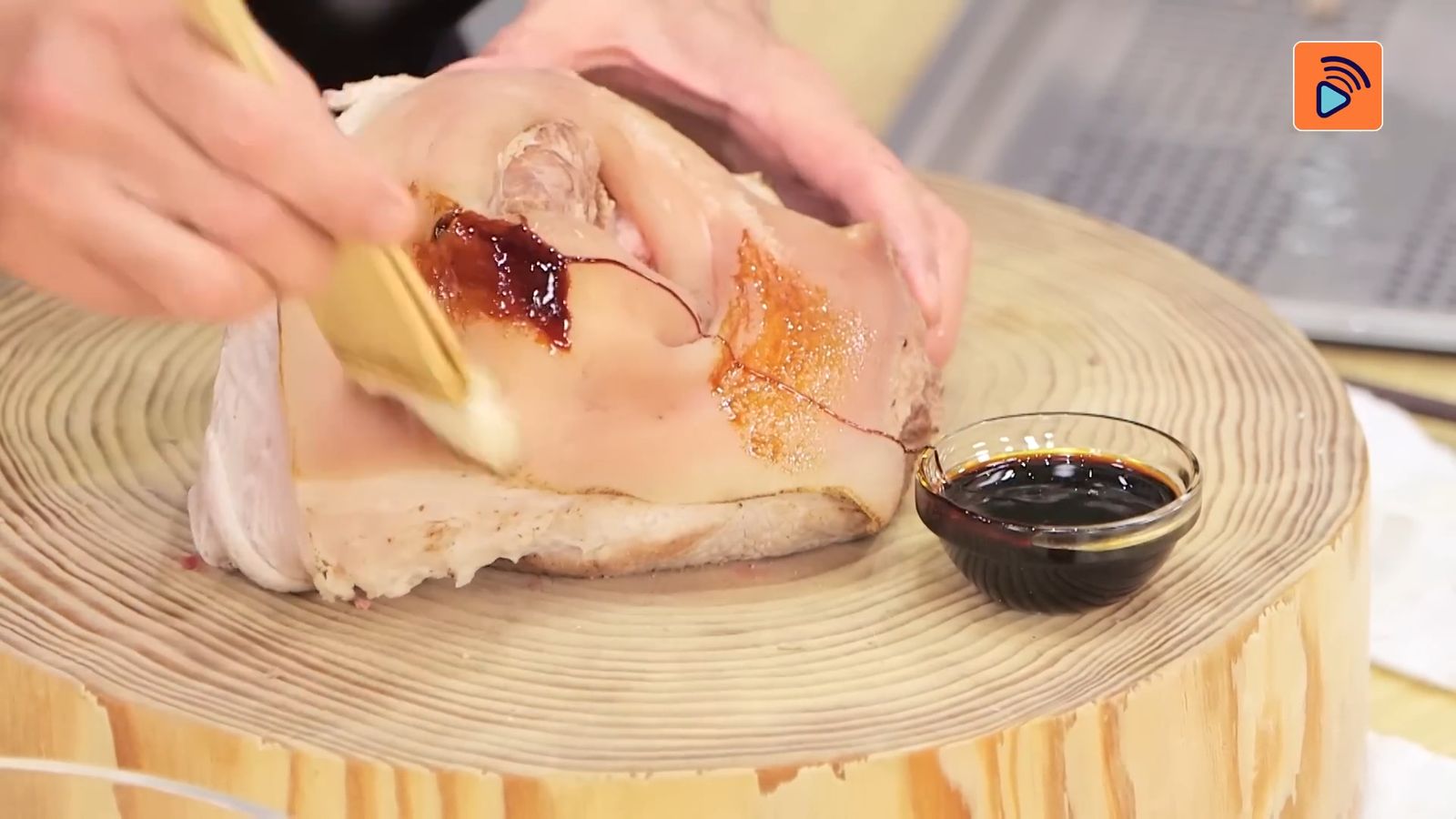 - 利用豬插在豬皮表面進行疏針,接著將滴珠油均勻塗抹在元蹄上,幫助其上色。