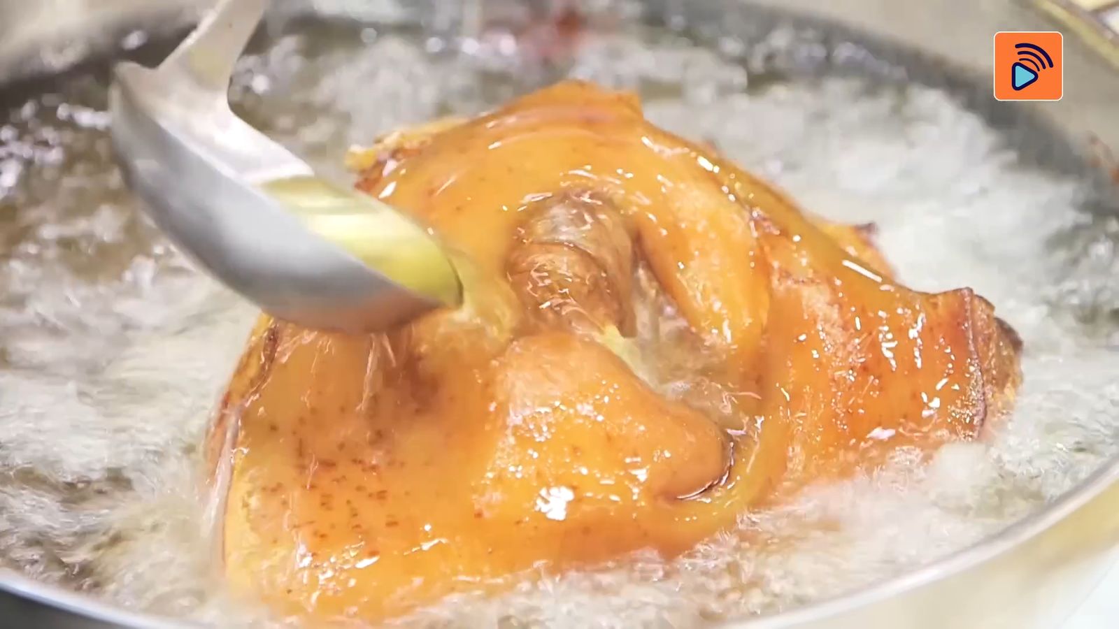 - 燒熱油鍋,放入元蹄進行走油步驟,此舉能逼出多餘油脂,完成後取出瀝乾油分。
