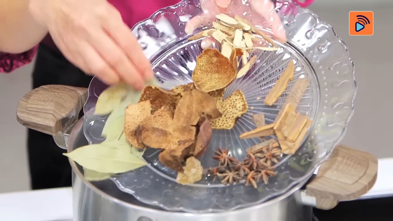 - 準備滷水汁,準備約2.5至3公升清水,放入陳皮、八角、桂皮、香葉、甘草、冰糖及胡椒,開大火滾煮30分鐘以釋放香料味道。