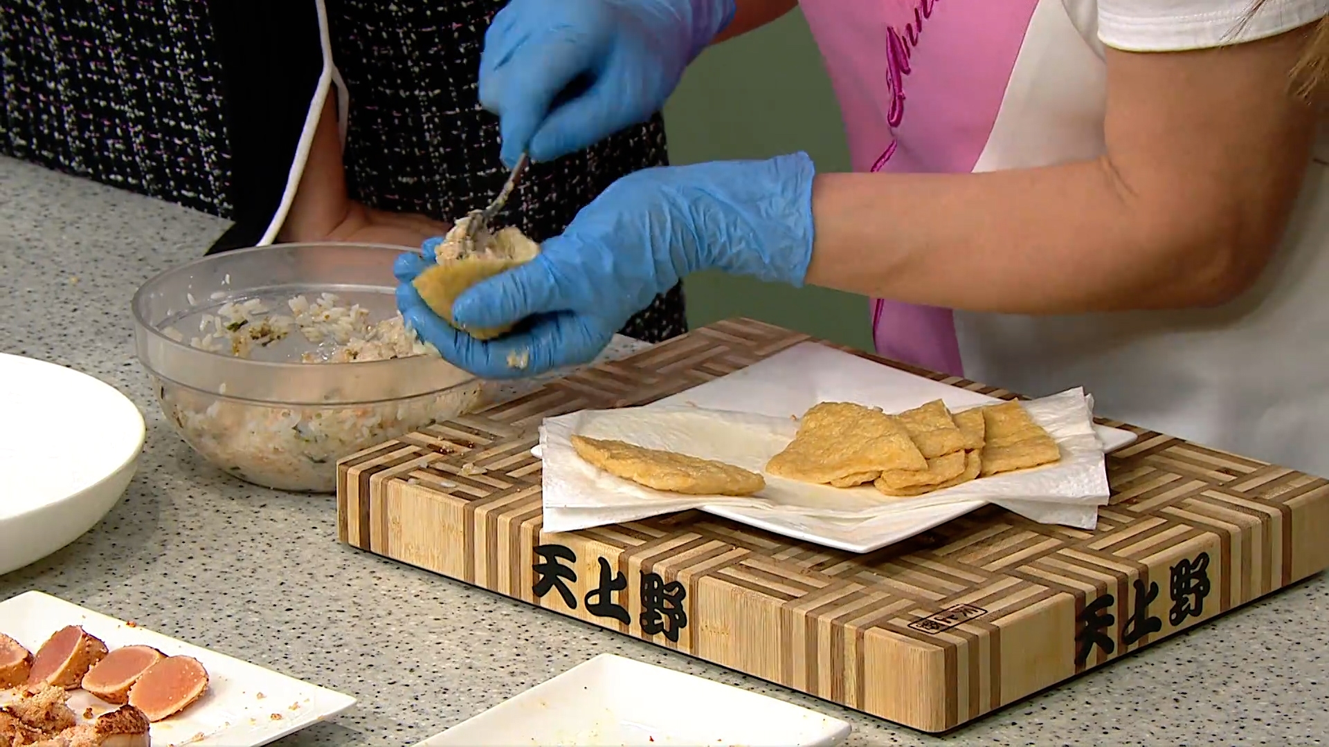 煎熟明太子之後切成多份備用,再適度烹煮糯米,加入飯素和明太子碎拌勻,就成為了美味的飯糰餡子,和一片明太子一起釀入豆皮內就能完成一件飯糰了。