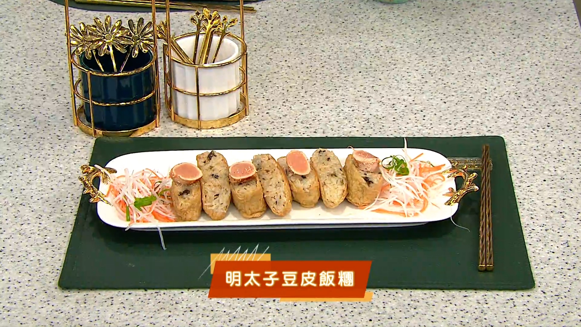 6.豆皮飯糰放於鑊內煎香,即可上碟並放上明太子片裝飾。