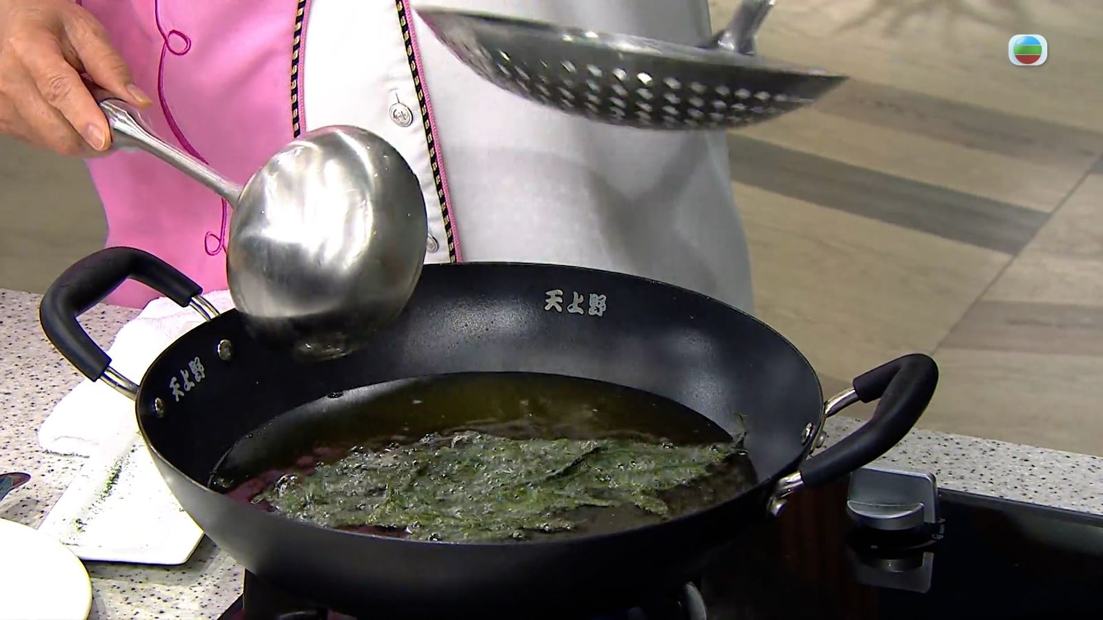 2.起油鍋,將苔條、辣椒葉先後稍為炸香,盛起隔油備用。