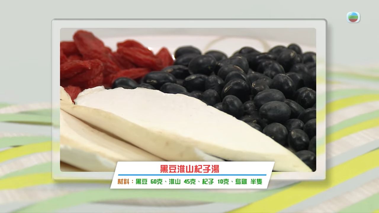 - 黑豆淮生杞子湯:黑豆60克、淮山45克、杞子10克、烏雞半隻。湯水有助補腎抗衰老、可以預防甩頭髮、白髮變黑,以及恢復元氣,補眼補腦,建議一星期服用兩至三次,持續一兩個月就可以,感冒患者不建議服用。