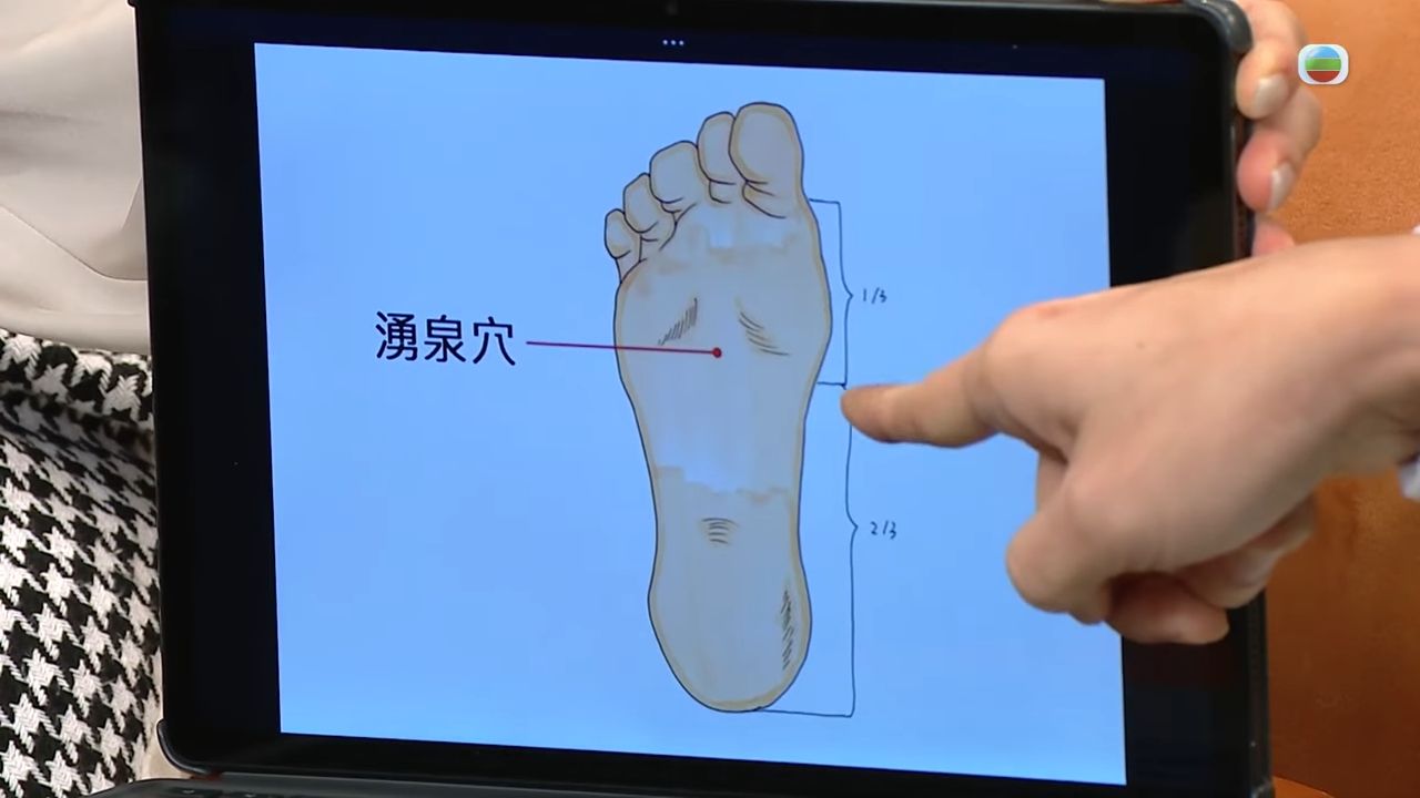- 湧泉穴:腳板底上三份一,以及下三份二的中間部份,建議用手指公放在穴位上,打圈柔按3至5分鐘,直至出現酸酸痹痹的感覺,或者直接考慮熱水浸腳10至15分鐘,期間要留意自己的呼吸,將意念集中在穴位上,這會有助補腎安神,舒緩緊張壓力和安眠,有着妙不可言的功效。
