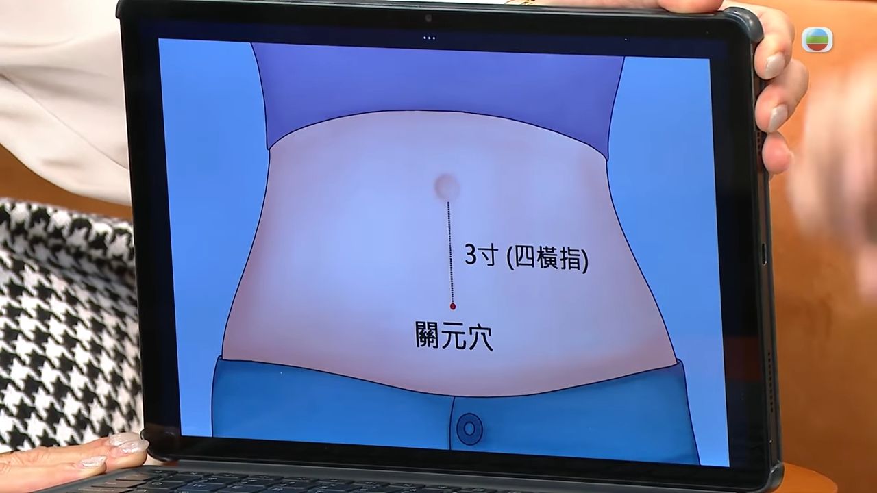 - 關元穴:位於肚臍對下3吋的位置,女士可以躺在床上,膝頭微微屈曲,將兩隻手放在穴位上,打圈柔按3至5分鐘,直至出現暖意,亦可考慮放置暖包在穴位上,則可以補益元氣,預防卵巢早衰。