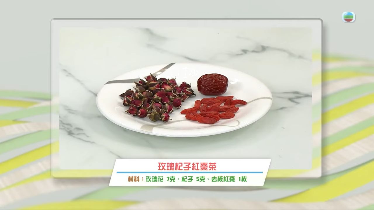- 玫瑰杞子紅棗茶:玫瑰花7克、杞子5克、去核紅棗1枚;可以有助舒緩緊張情緒、調經作用、亦可以補眼補腦,以及補血,令到面色恢復紅潤。一個星期同樣建議服用兩至三次,感冒患者不建議服用。