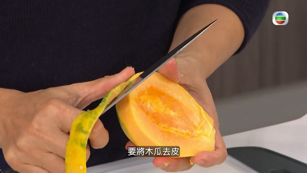用刀把木瓜切開一半,用匙羹將中間的籽掏出,再去皮,最後切片。