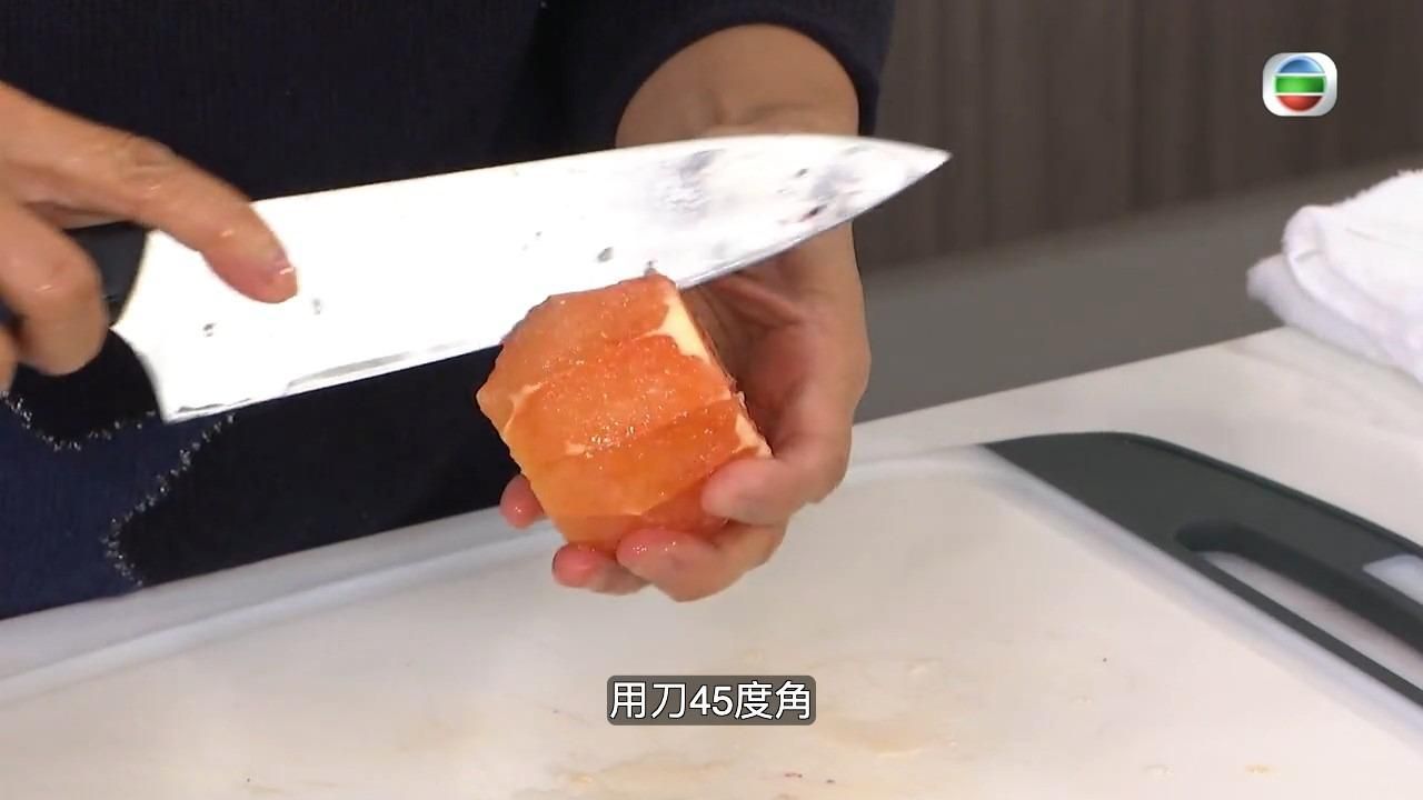 在西柚頂部橫向切一刀,隨後在底部亦切一刀;用刀慢慢切開皮層;依隨果肉白邊,用刀45度角切開果肉。