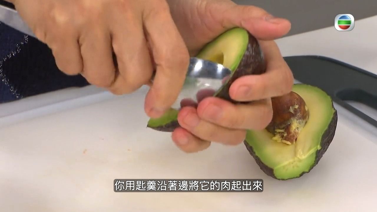 先把牛油果切半,再用匙羹沿邊把肉起出,用刀把果肉切片塊。