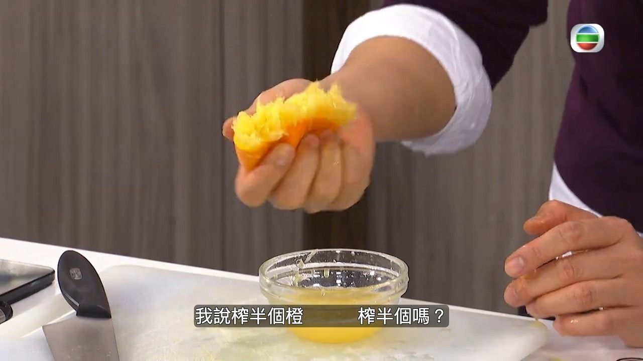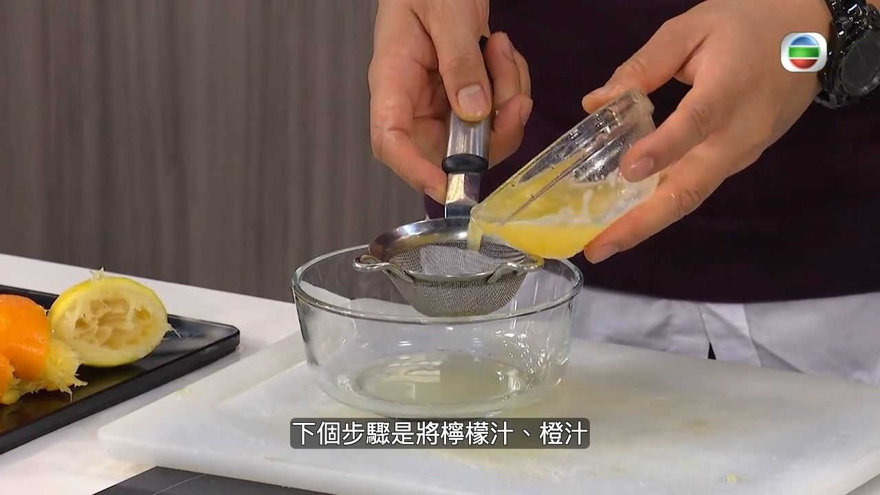 把已切半的將檸檬和香橙榨汁,將檸檬汁,橙汁、黃芥末、蜜糖、鹽與胡椒粉放進碗內攪拌,並且隔渣,最後加入橄欖油攪拌。