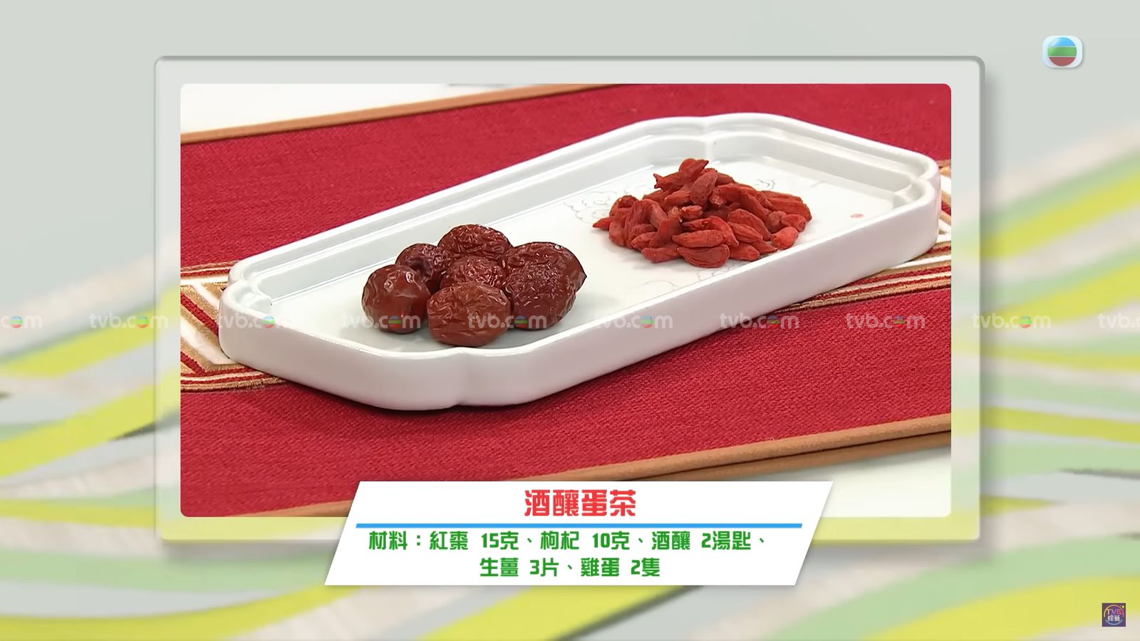 材料:紅棗 15克、枸杞 10克、酒釀 2湯匙、生薑 3片、雞蛋 2隻