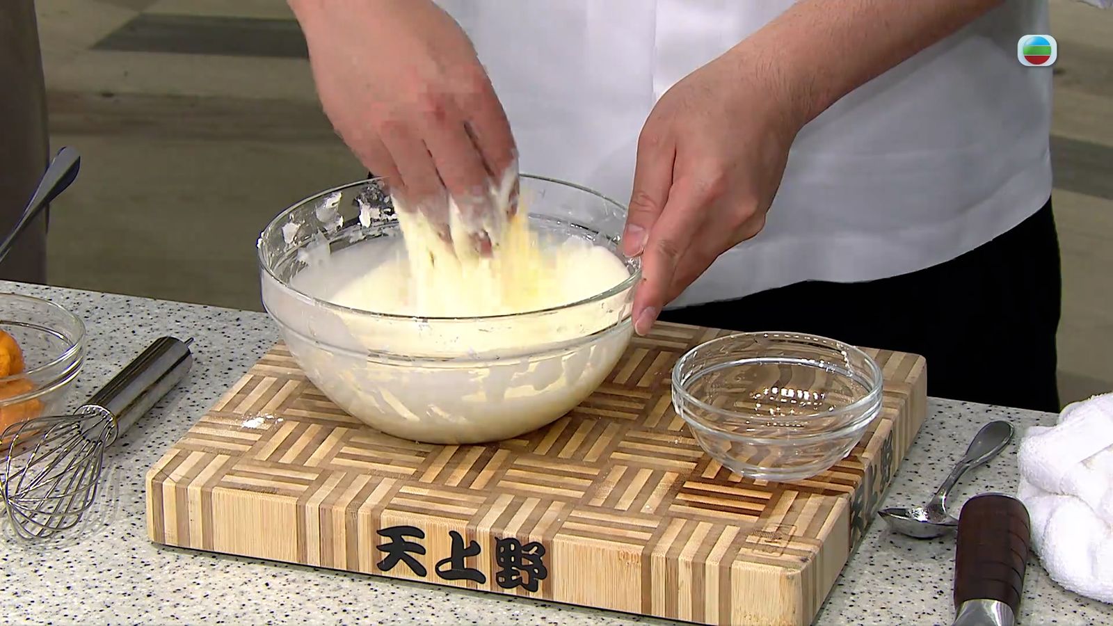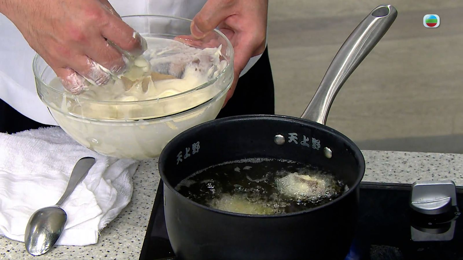 將麵粉、粟粉、泡打粉連同1隻雞蛋一起拌撈,緩慢地加水以防起粒,並攪勻過程中加少許油,放置一會起發成脆漿備用。