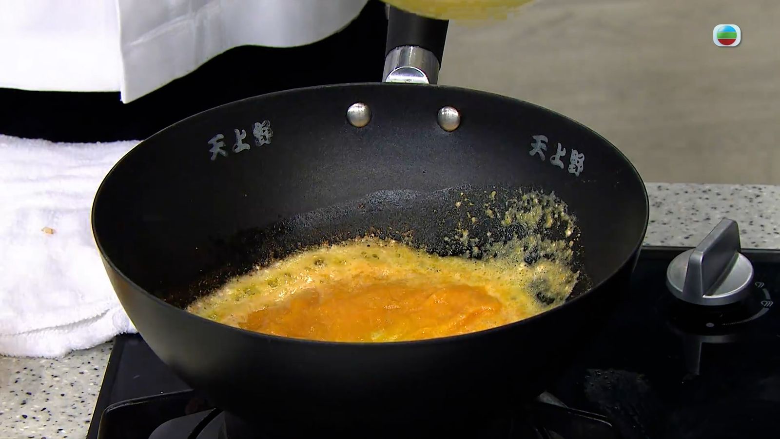 4.熱鑊中放入牛油,再加入預先蒸熟的金沙醬,現泡沫時加少許上湯、辣椒粉、麵撈、花雕酒,成為黃金蘸醬。