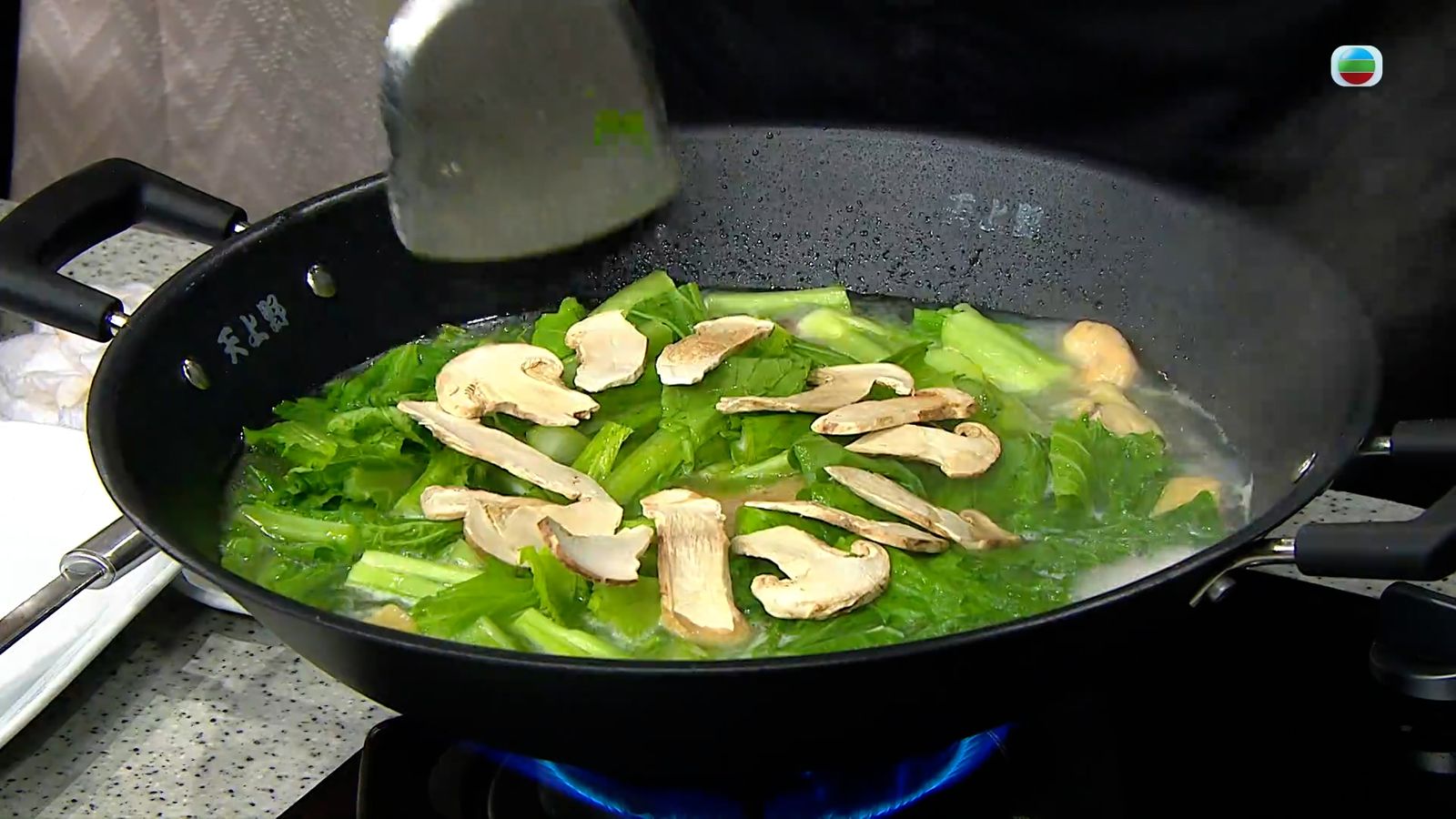 然後倒去除多餘油分,再加水、薑塊、春菜、松茸繼續煮。