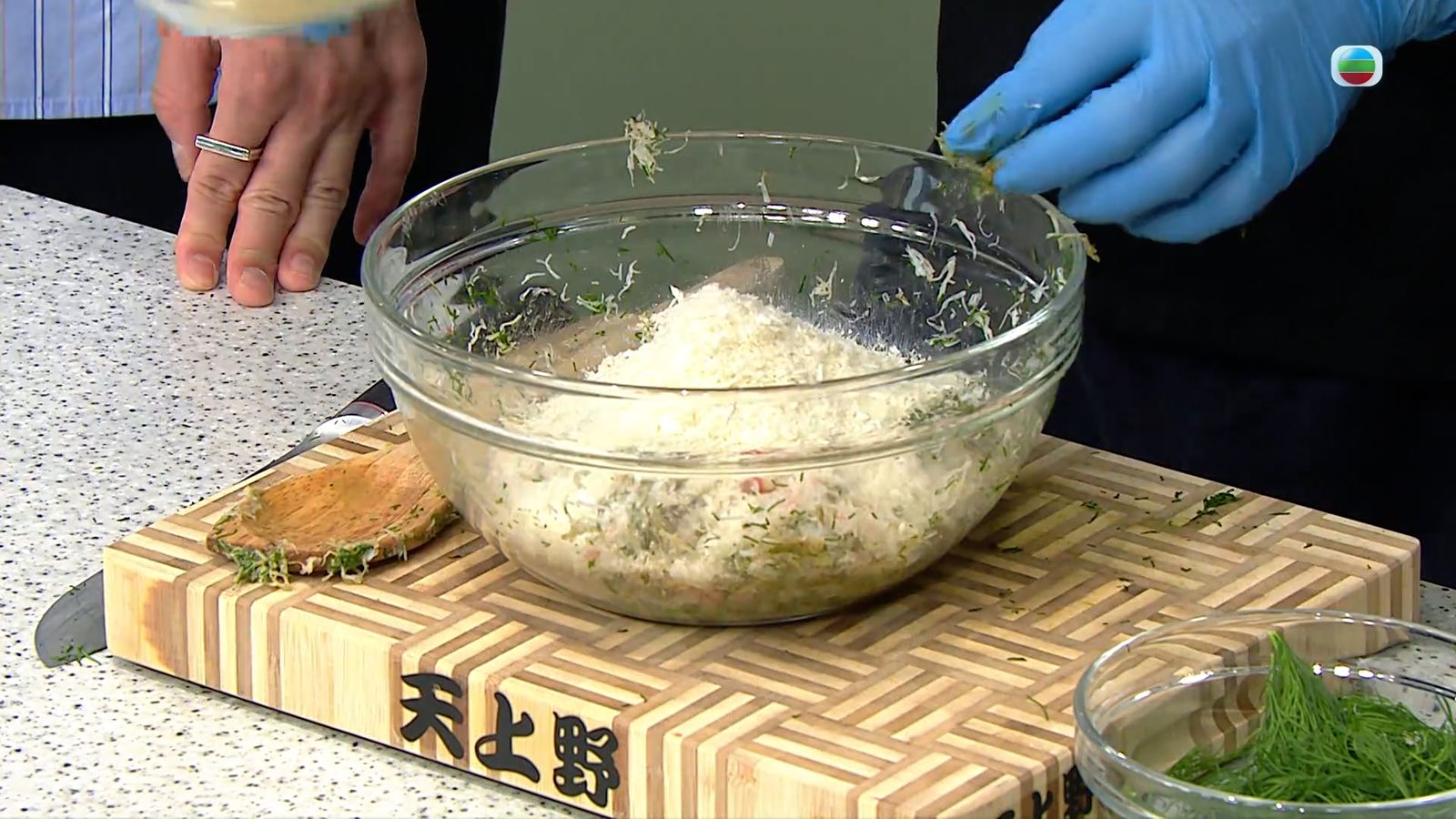 將蒔蘿切碎,將蒔蘿和蟹膏加至松葉蟹上。
