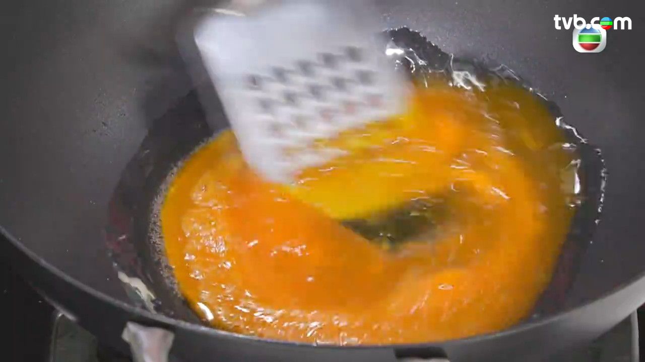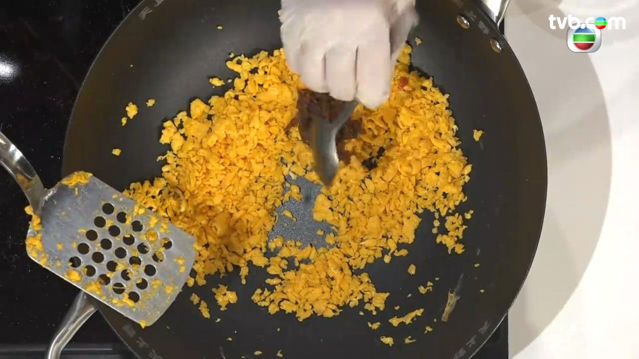 - 4蛋黃及1蛋白加入一點油、鹽,放入熱鍋,慢火不斷攪拌炒至一粒粒,好像桂花般,加入XO醬調味