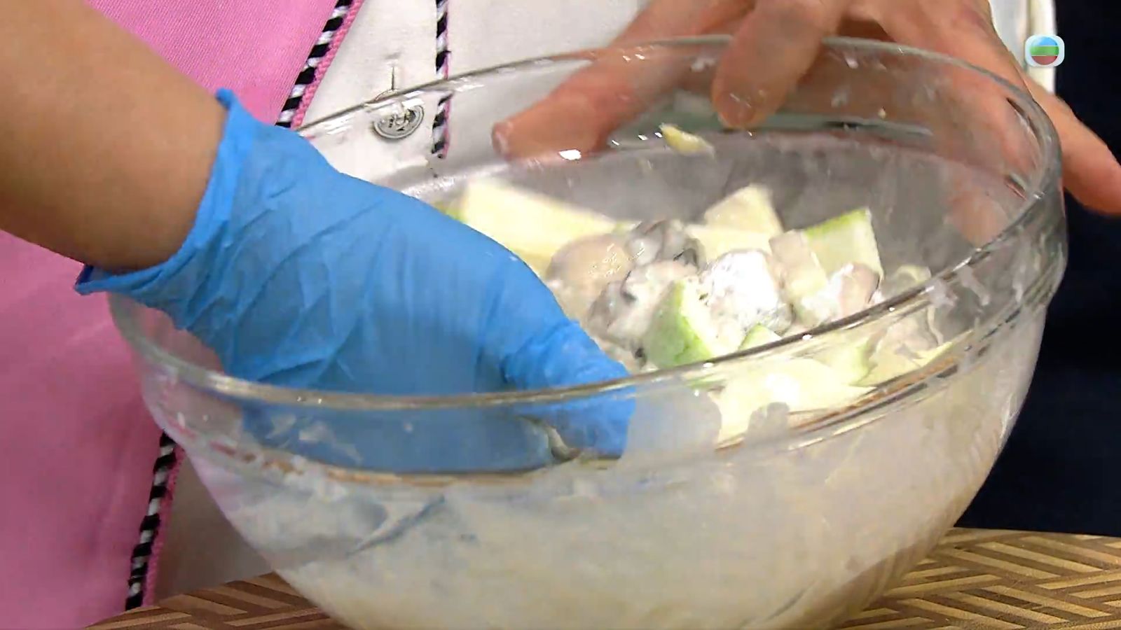 水瓜放碗裡,拌入番薯粉、炸粉,加水拌勻,再拌入蠔仔及番薯粉、炸粉撈勻成粉漿。適量拌入豆瓣醬、胡椒粉、魚露調味。