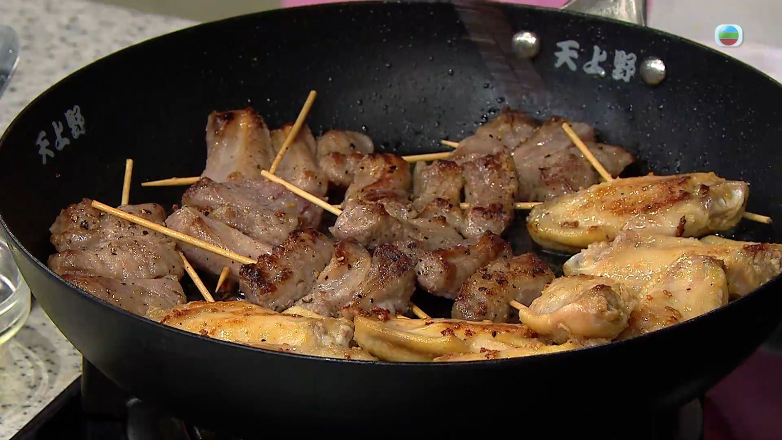 雞翼及豬肋條肉分別串起,在另一個油鍋中兩面煎熟即可取出。