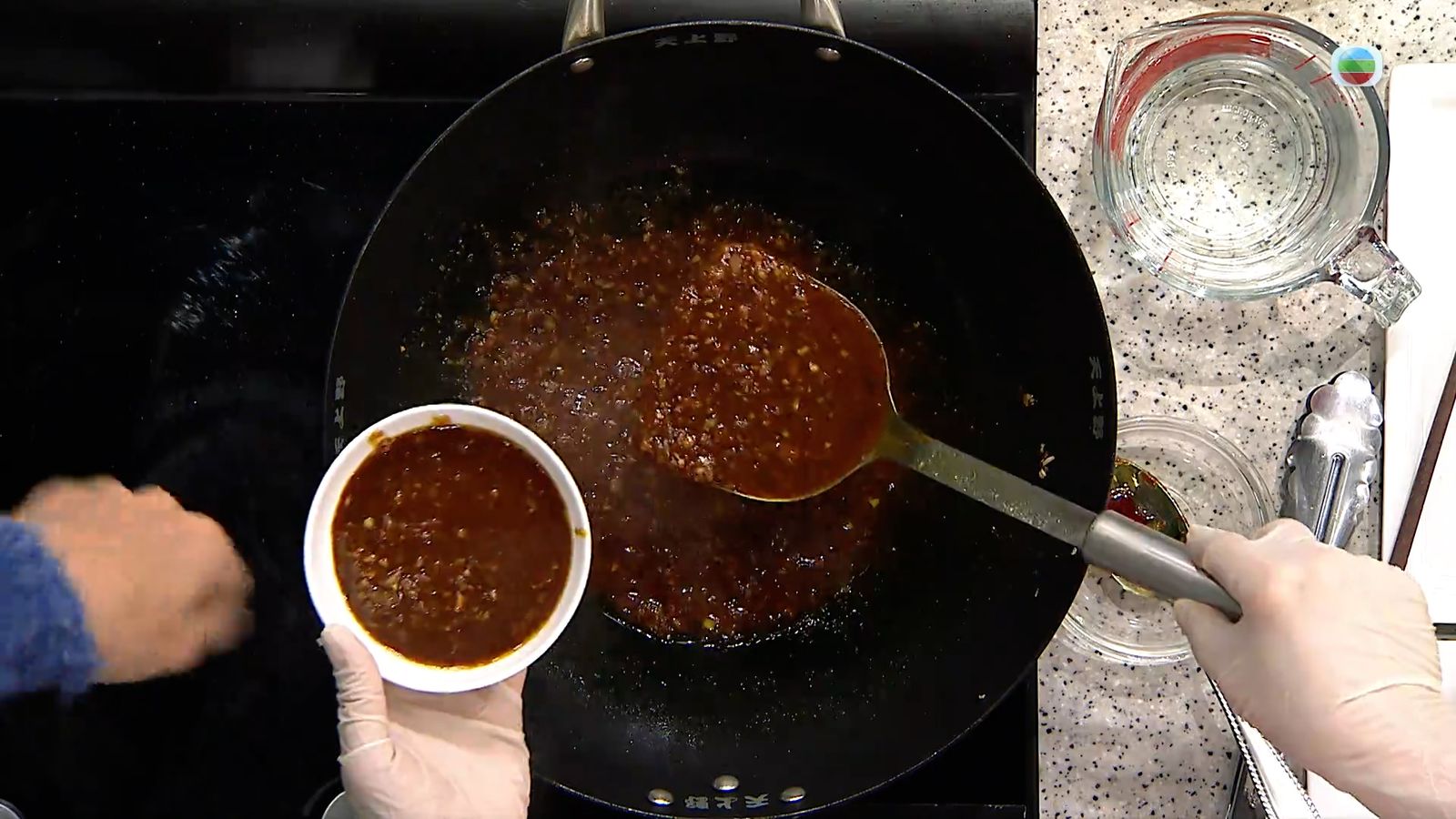 起一油鍋,爆香蒜蓉及乾蔥碎後加入大量的糖和風味醬,調味過後取出一半作為點醬留用。
