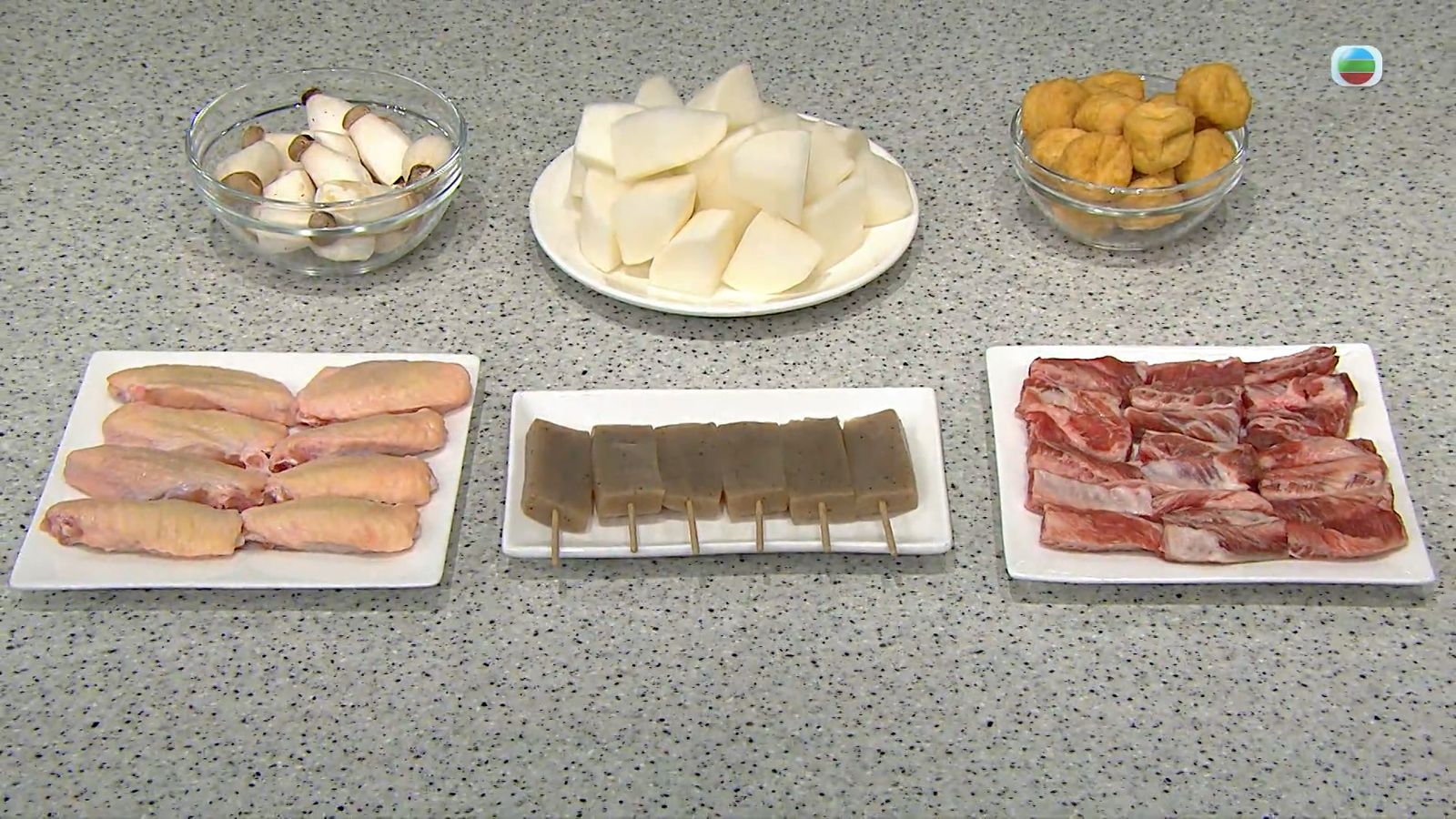 Annie師傅動用六種食材炮製除夕大餐。雞翼、豬肋條分別醃半小時備用;鮮菇切掉底部沖淨備用;白蘿蔔選重身的去皮沖淨;豆卜及蒟蒻同樣沖淨備用。