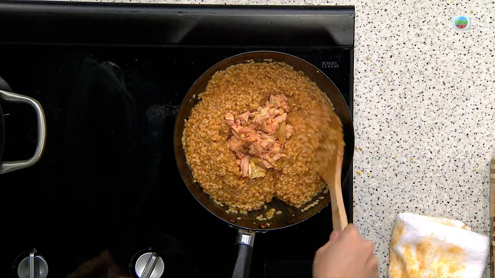 取出整雞備用。將湯面的油移至另一個鍋中,下洋蔥炒至變軟,然後加入日本米兜勻,逐少加入煮雞湯煮勻。