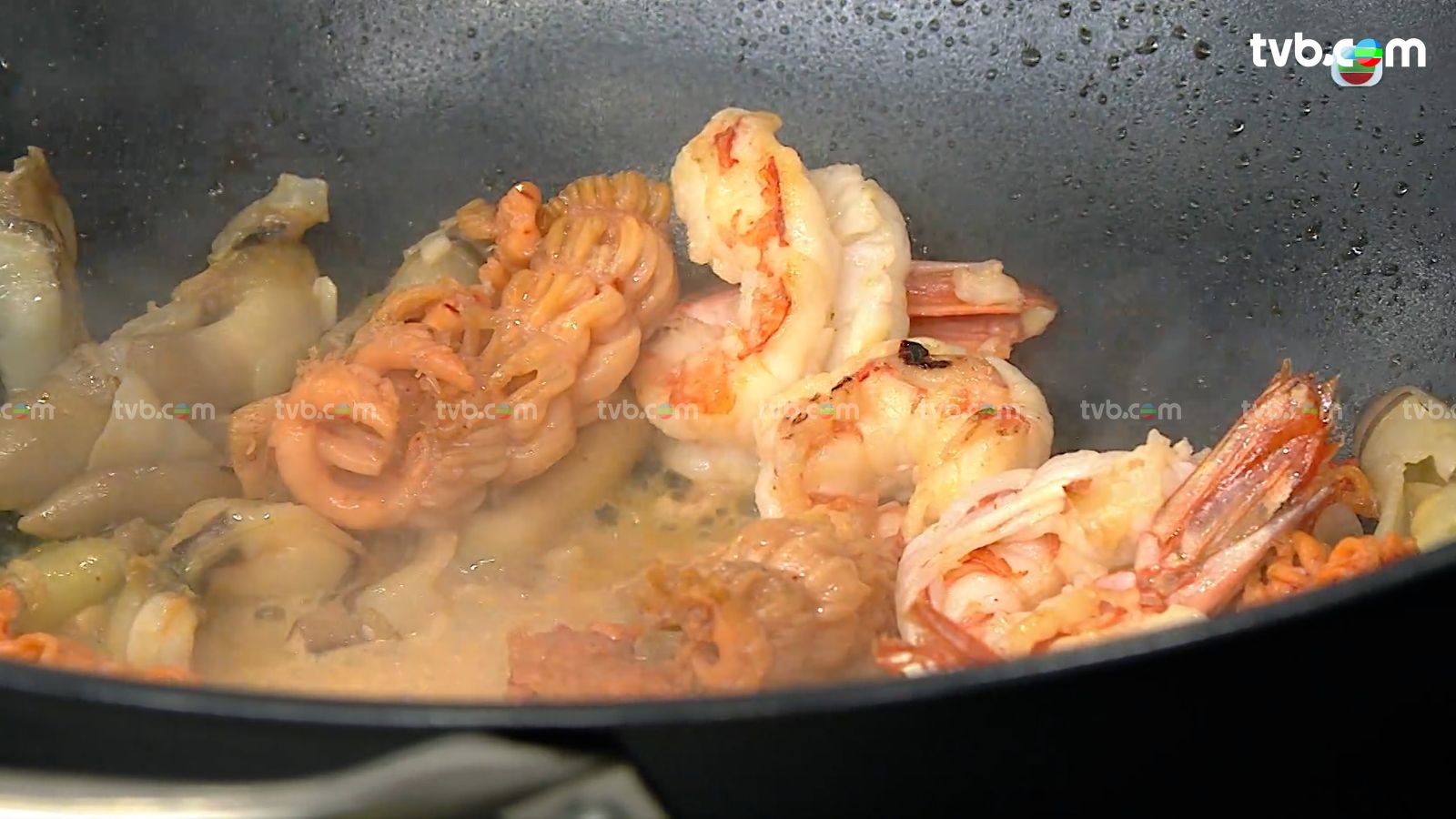 起油鍋,爆香蝦和蒜蓉,再加入其他海鮮兜炒至熟透。