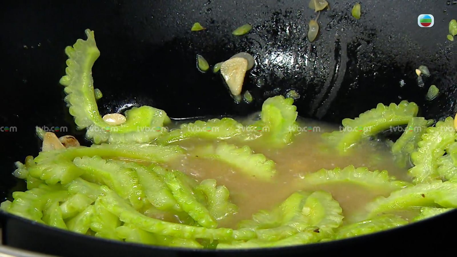 涼瓜去瓤切片,起油鍋爆香蒜片後下涼瓜兜炒,炒斷生後注入雞湯,下生抽調味後再煮一會。