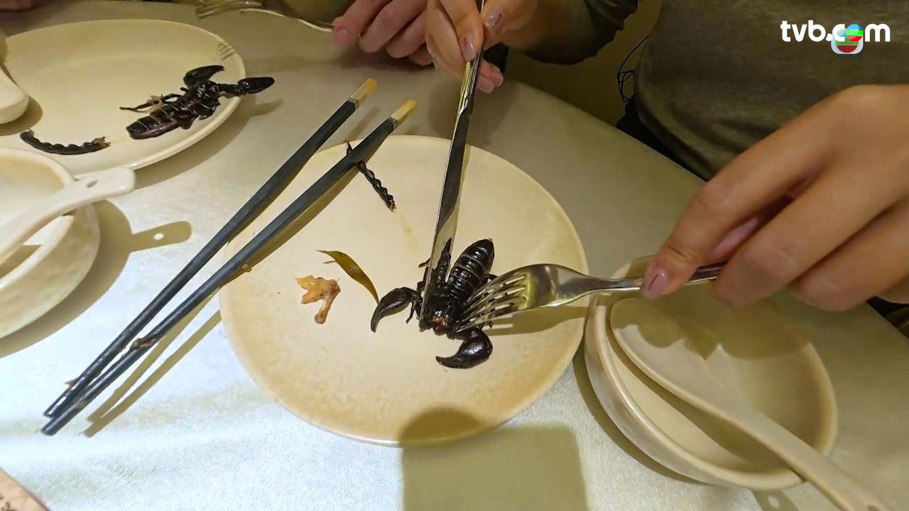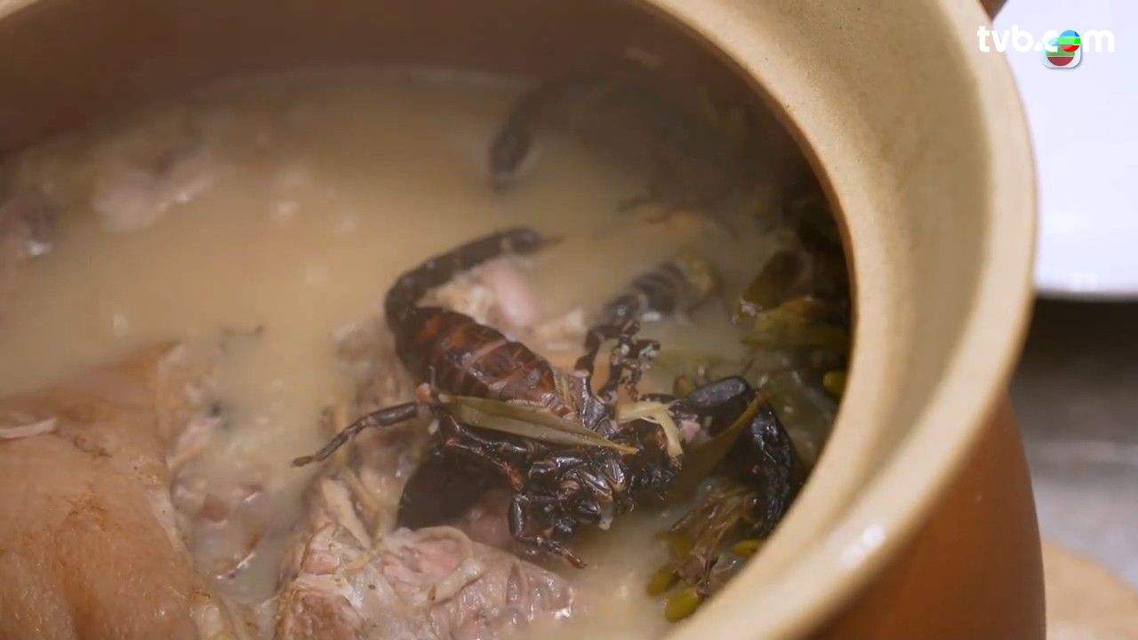 主角「蠍子」外型嚇人,但食落帶點甘甜,越嚼越甘,曾展望指感覺竟然與「蟹膏」十分相似!湯水方面,味道濃濃的,入口帶鹹香,帶有十分突出的草本香氣,而三位一同大讚湯水好喝!
