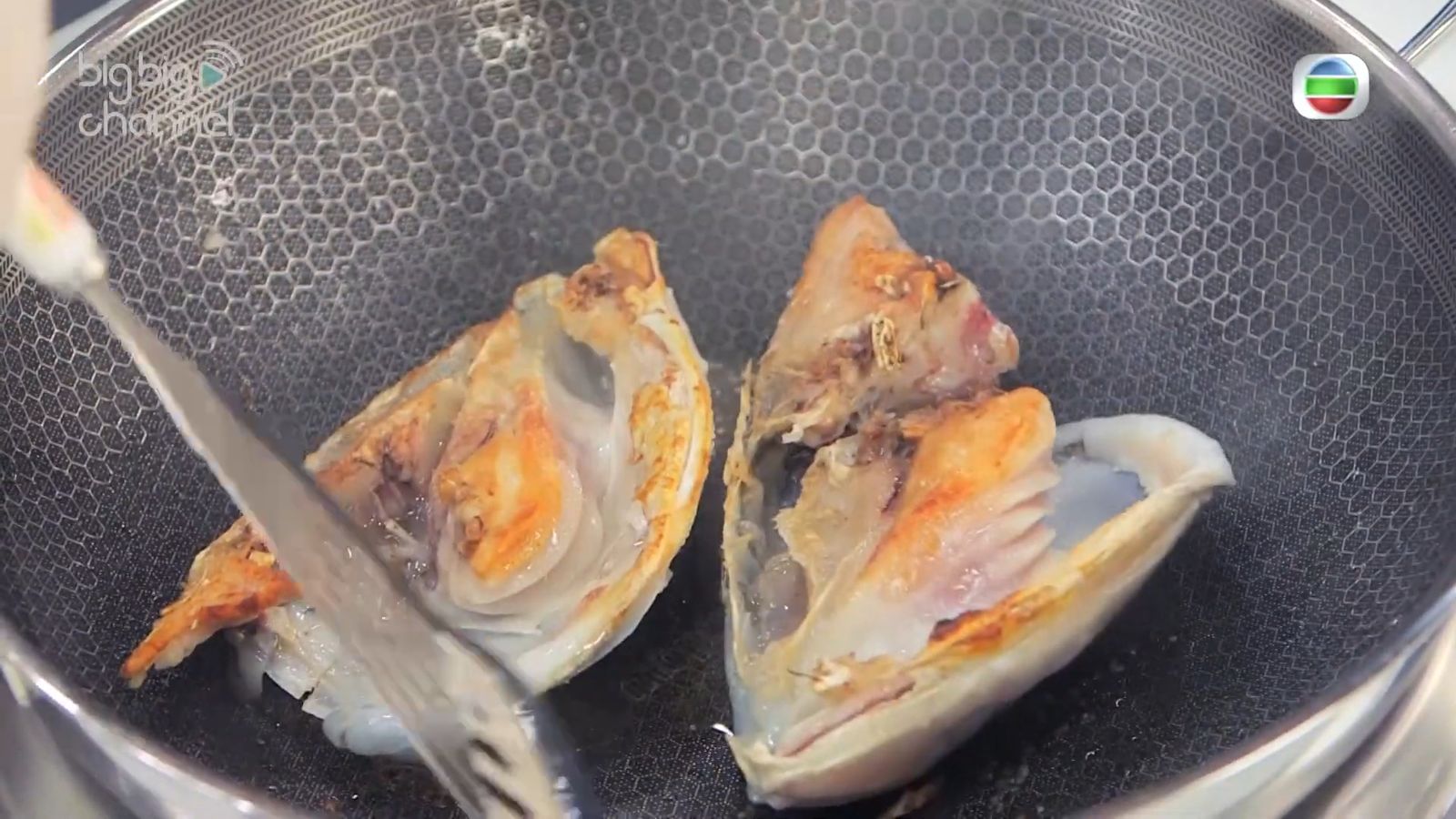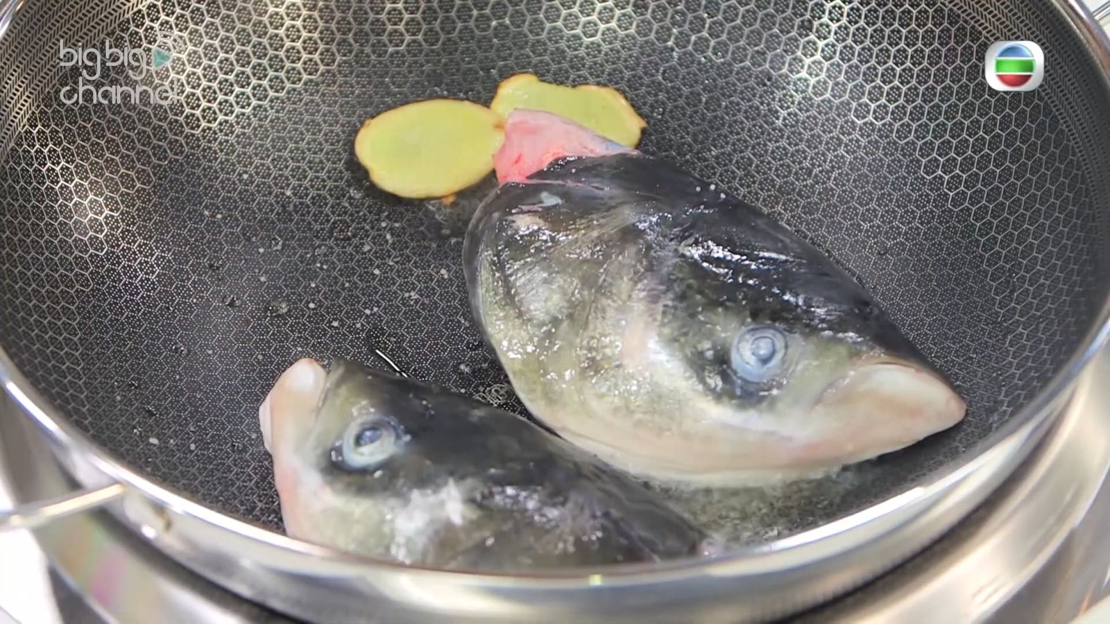 - 先在煎鑊上落油、薑片和少量鹽爆香,然後再放大魚頭,煎到金黃色。