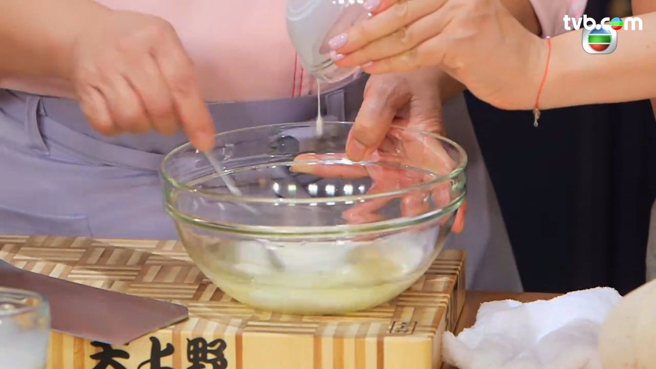 - 打勻蛋白,倒入椰皇水,全部拌勻後加入冰糖水,篩一篩後加入鮮奶拌勻