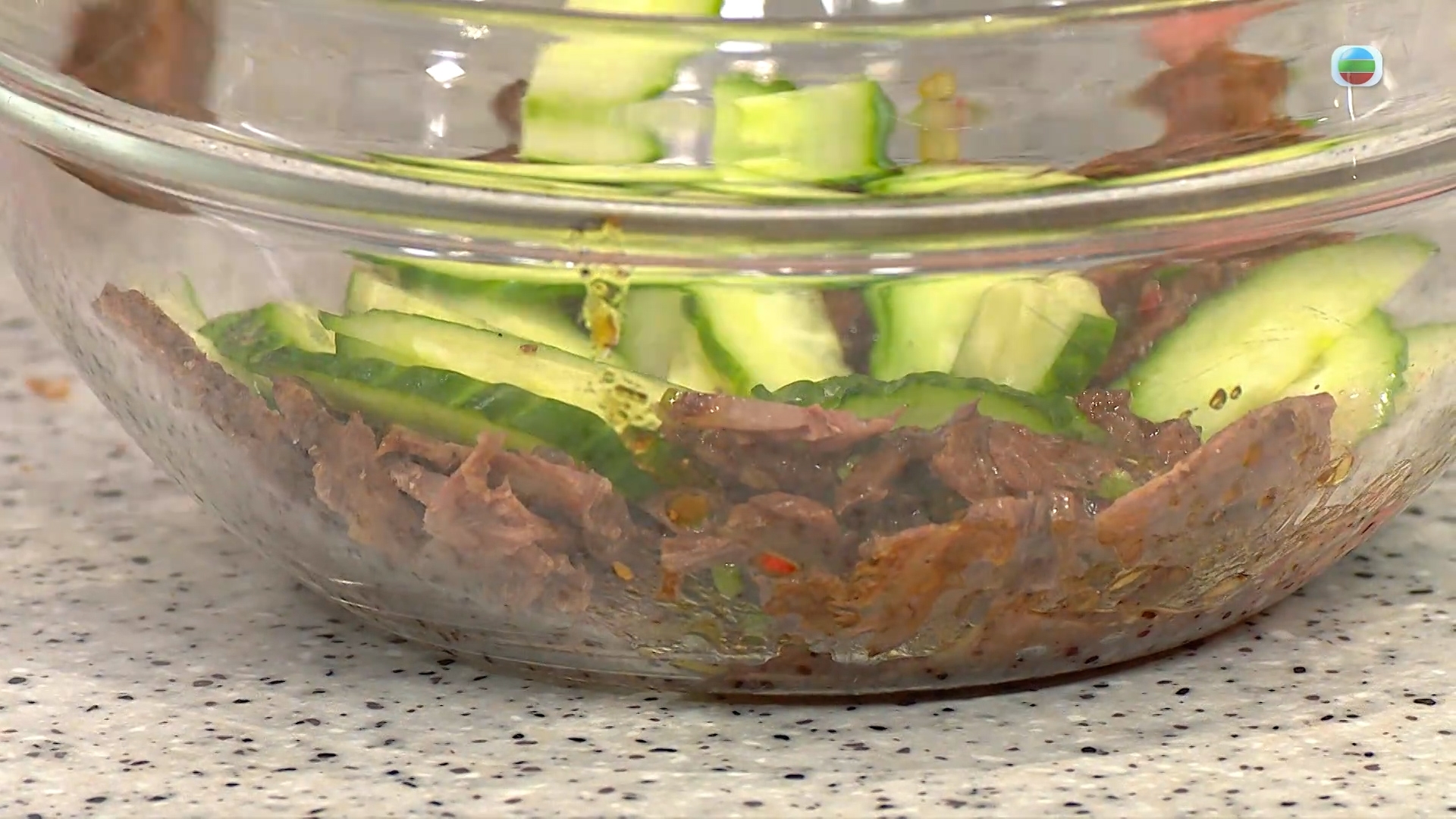 5. 放入牛腱片和少量青瓜片,倒入醬汁拌勻。