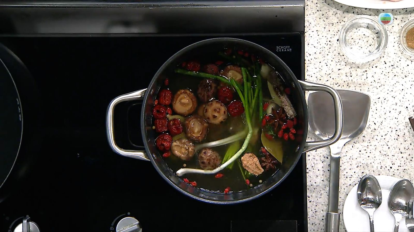 杞子跟冬菇事先浸軟,紅棗去核,生薑蒜頭略拍。然後把湯料全放煲內煮滾備用。