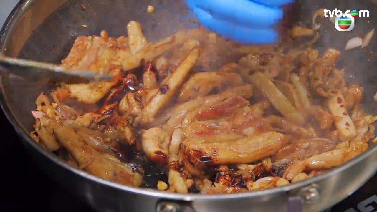 - 五花腩切條,放入白鑊翻炒,再落乾蔥,豬肉軟身後放入蒜頭、冰糖、一點水、胡椒粉、五香粉、白醋、蠔油、老抽、紹興酒,過程中不斷翻炒,最後加水