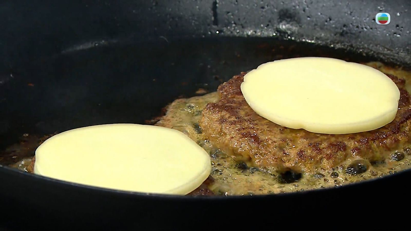 5.將(2)牛肉球放入已下油的熱煎鑊內,按壓成薄塊並煎至焦黃,翻轉另一面繼續煎至焦香,並鋪上芝士片。