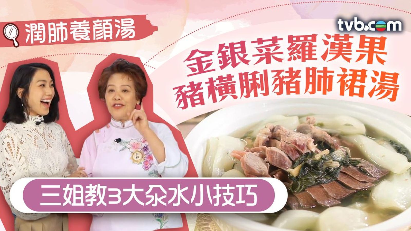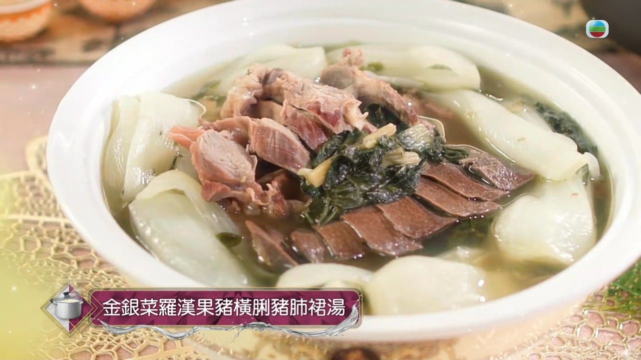 蕭秀香(三姐)曾在TVB節目《三餸一湯》中,教姜麗文煲「金銀菜羅漢果豬橫脷豬肺裙湯」,這款湯水潤肺又養顏,飲落仲好清甜!今次所用到的金銀菜,其實是指兩種白菜,包括白菜乾及新鮮白菜。另外,金羅漢果營養價錢較高,較甜一些,清甜潤喉。而豬橫脷有潤肺、去肝火的作用,可增強抵抗力。