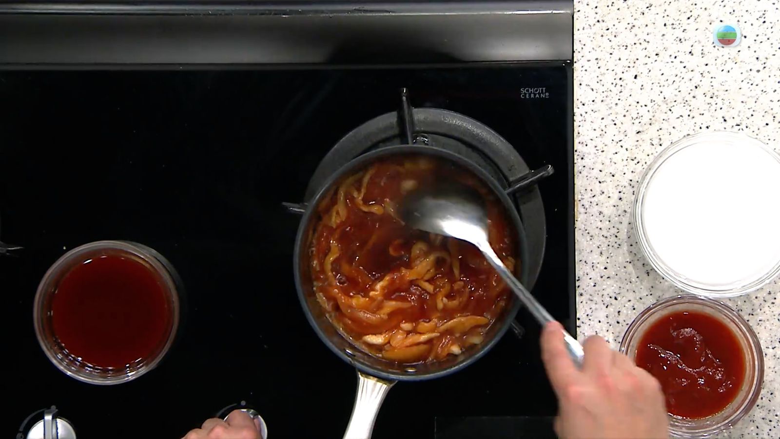 3.水煮沸,下番茄汁、已炒熟的雞絲及配料,下鹽、糖調味料,加入生粉煮至收汁,注入糖醋煮勻成番茄汁,備用。