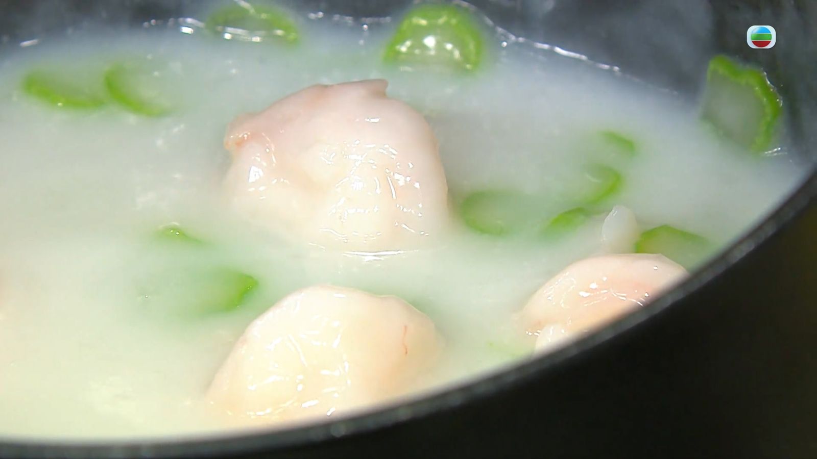 5.再煮一鍋沸水,放入蝦仁、菜粒、鹽、糖煮勻,下生粉煮至收汁,注入牛奶煮勻成白汁。
