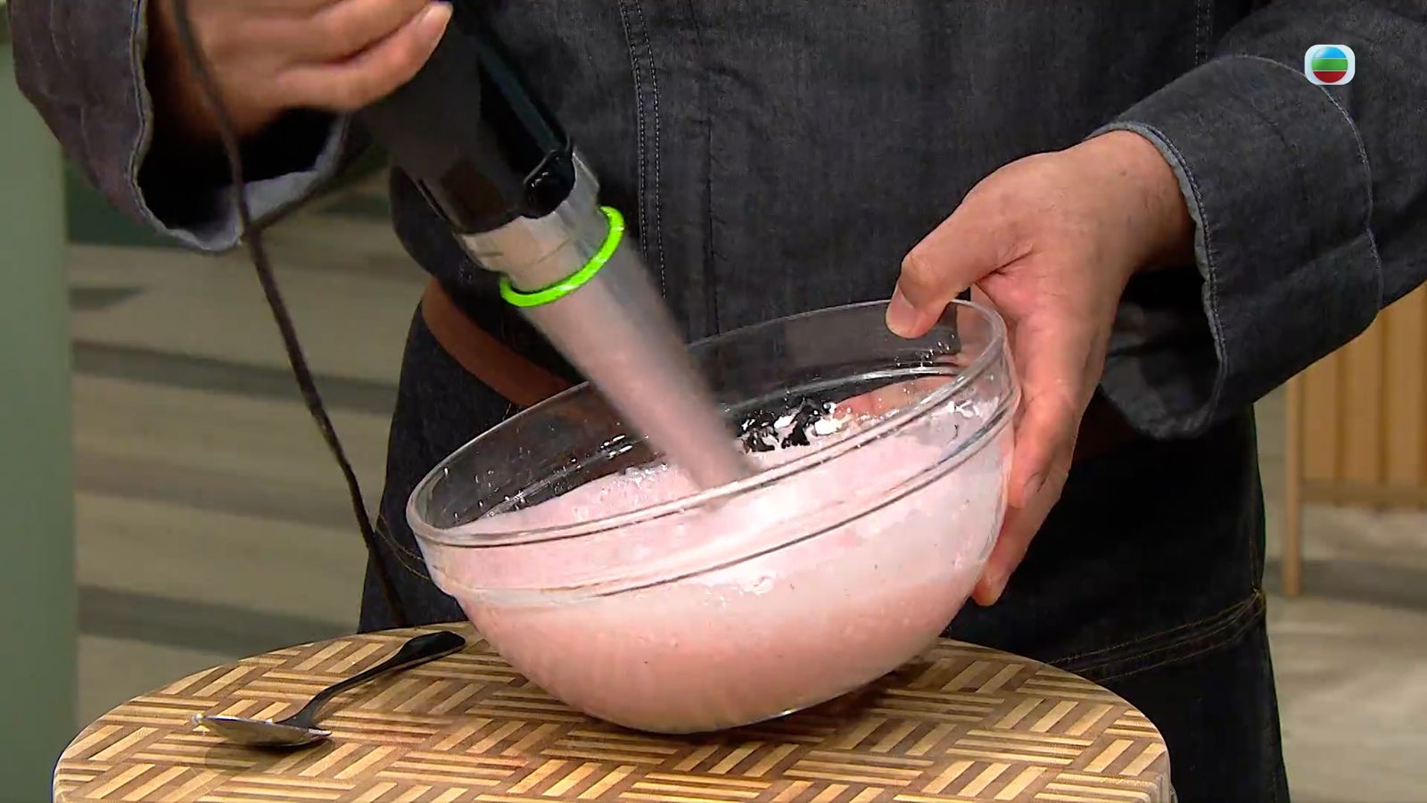 把脆漿材料拌勻,用攪拌器打至幼滑備用,由於加了紅菜頭汁,脆漿將呈現為粉紅色。